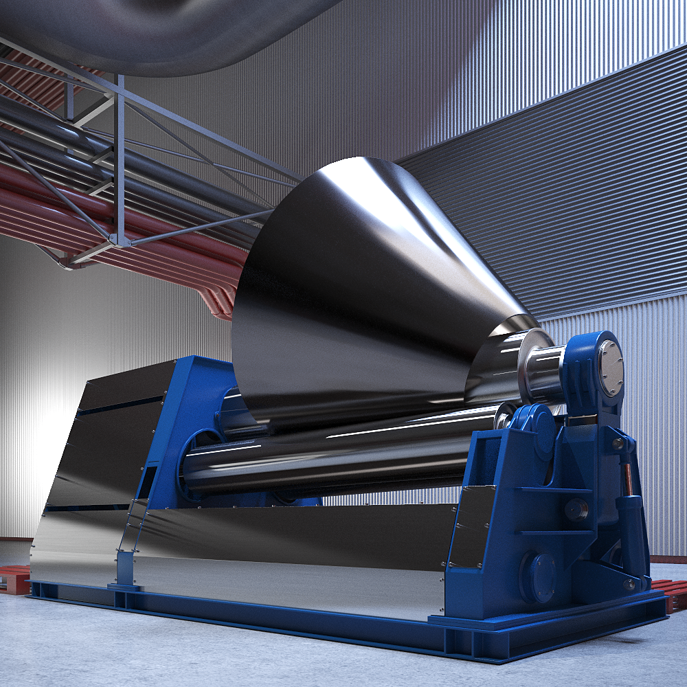 • Конструкция: Два нижних опорных валка и один верхний прижимной, который можно наклонять для формирования конуса.